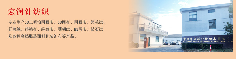 常熟市宏潤(rùn)針紡織品有限公司位于位于秀麗名城--常熟市碧溪街道滸浦李袁中路54號(hào),交通便利,環(huán)境優(yōu)越。專業(yè)生產(chǎn)法蘭絨及3D三明治網(wǎng)眼布、3D網(wǎng)布、網(wǎng)眼布、短毛絨、舒美絨、緯編布、經(jīng)編布、珊瑚絨、KS網(wǎng)布、鉆石絨及各種高檔服裝面料和裝飾布等產(chǎn)品。同時(shí),可根據(jù)客戶需求提供各種規(guī)格、品種、顏色 的產(chǎn)品。